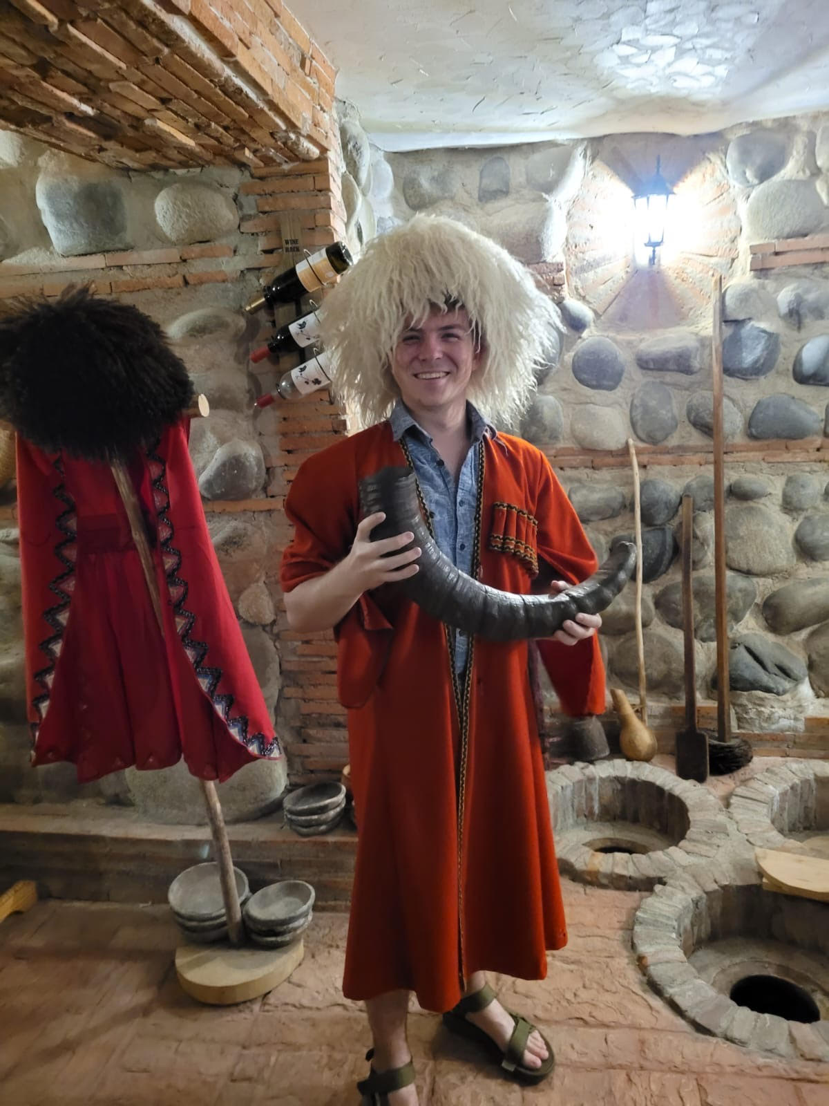 Georgia was rich with tradition. One of the locations we visited allowed us to try on a traditional outfit (as seen in the picture below). They used hollowed horns from goats and rams (also found in image below) to drink their wine from, with a few traditions behind them. One of the most notable traditions with a wine horn is that when Georgians have a drink, it must be a full size, you cannot ask for just half a glass, these horns were quite large so I would imagine that to be difficult. Another tradition is that with major parties (such as weddings) will all contain a toast the toast must be in depth and relate to the event. Also relating to parties, if a man is offered a drink from a horn he must either drink it completely, or leave the function. That tradition is not as common anymore, but it is still frowned upon to deny such offers.