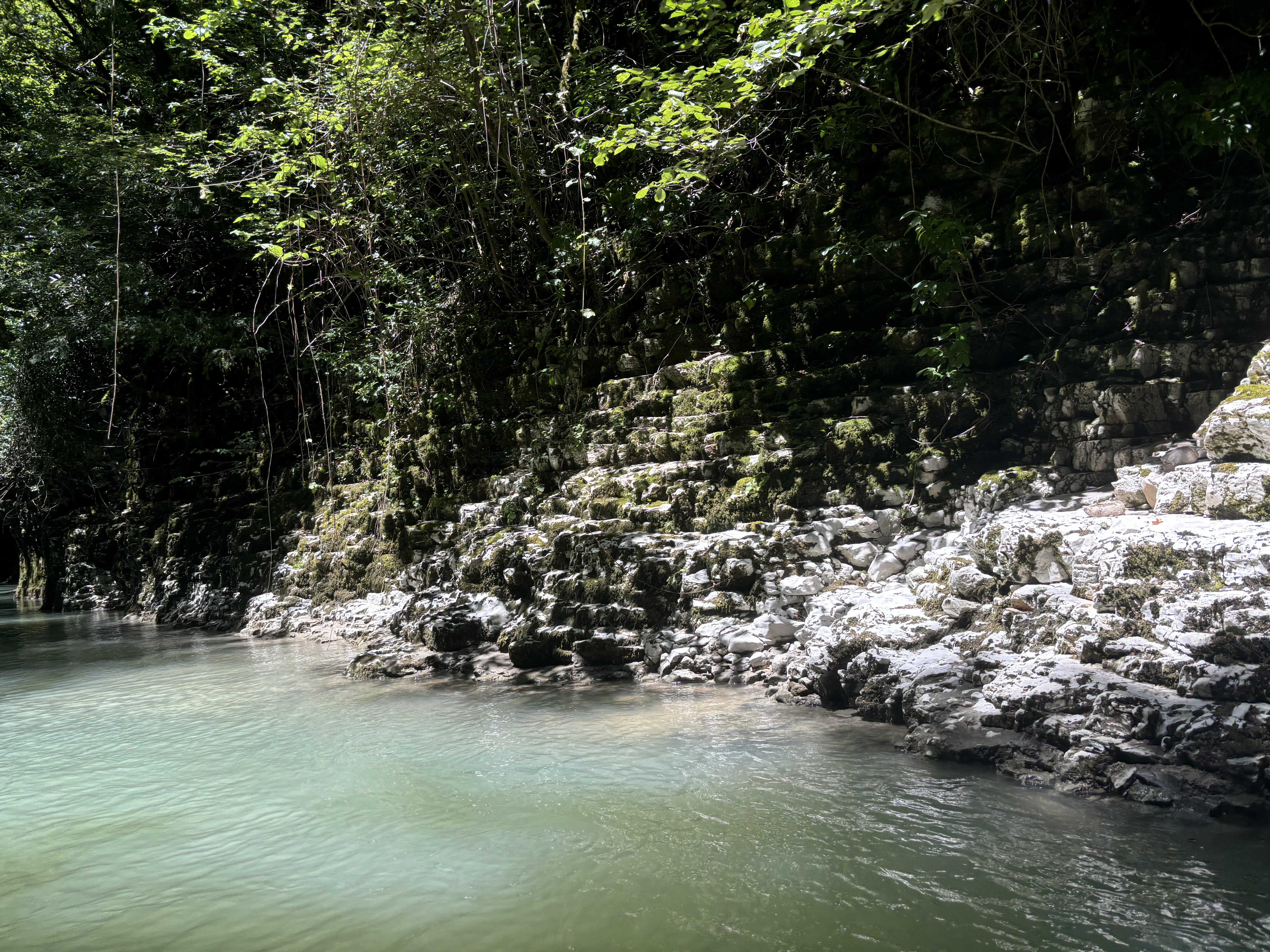 The Martvili Canyon was our stop after the Prometheus cave. We went to do a boat tour through the canyon and much to my surprise the Professor and another student on the trip were both told to sit in the front of the boat and were given paddles. There was a strong current that was caused by a waterfall up the canyon that we went to see. The canyon was narrow with the walls high up and covered in plants.