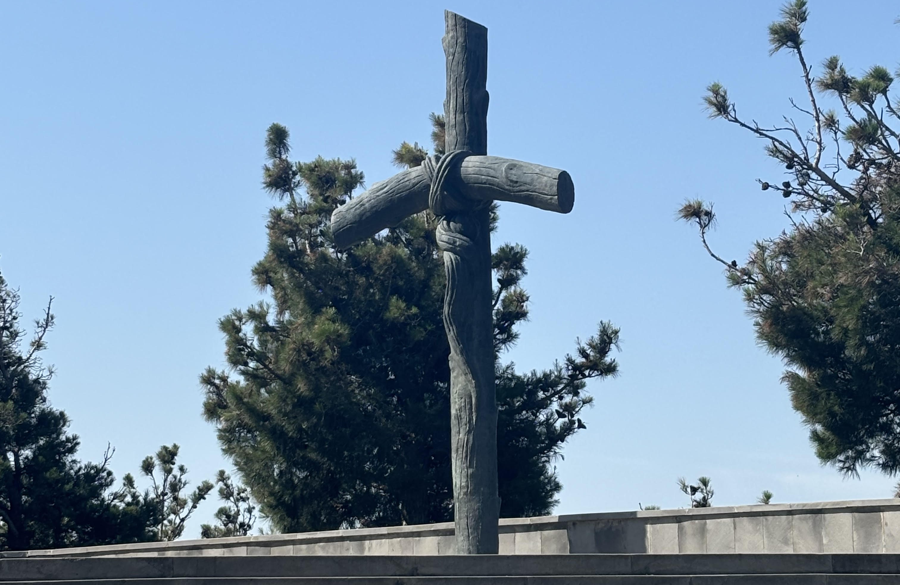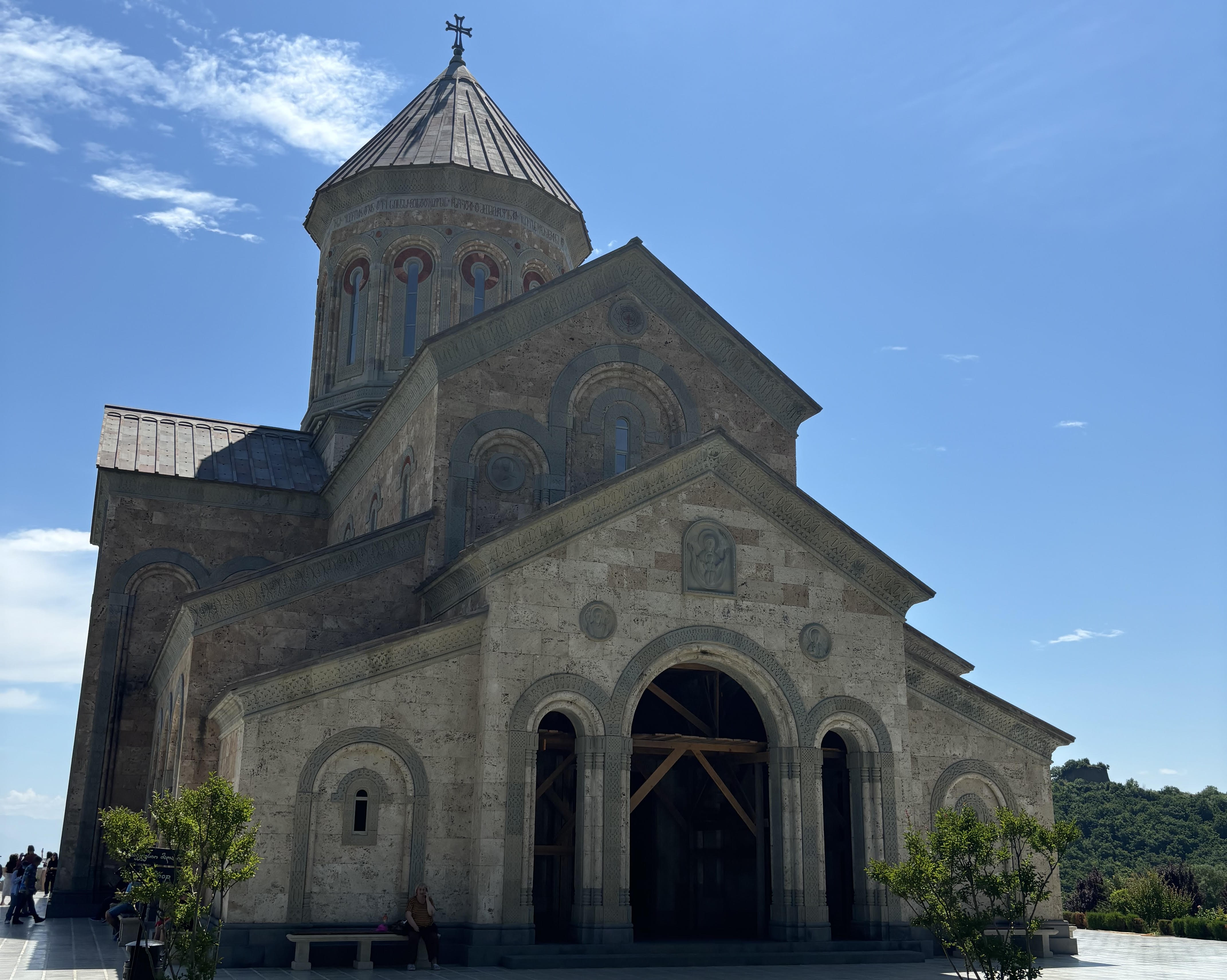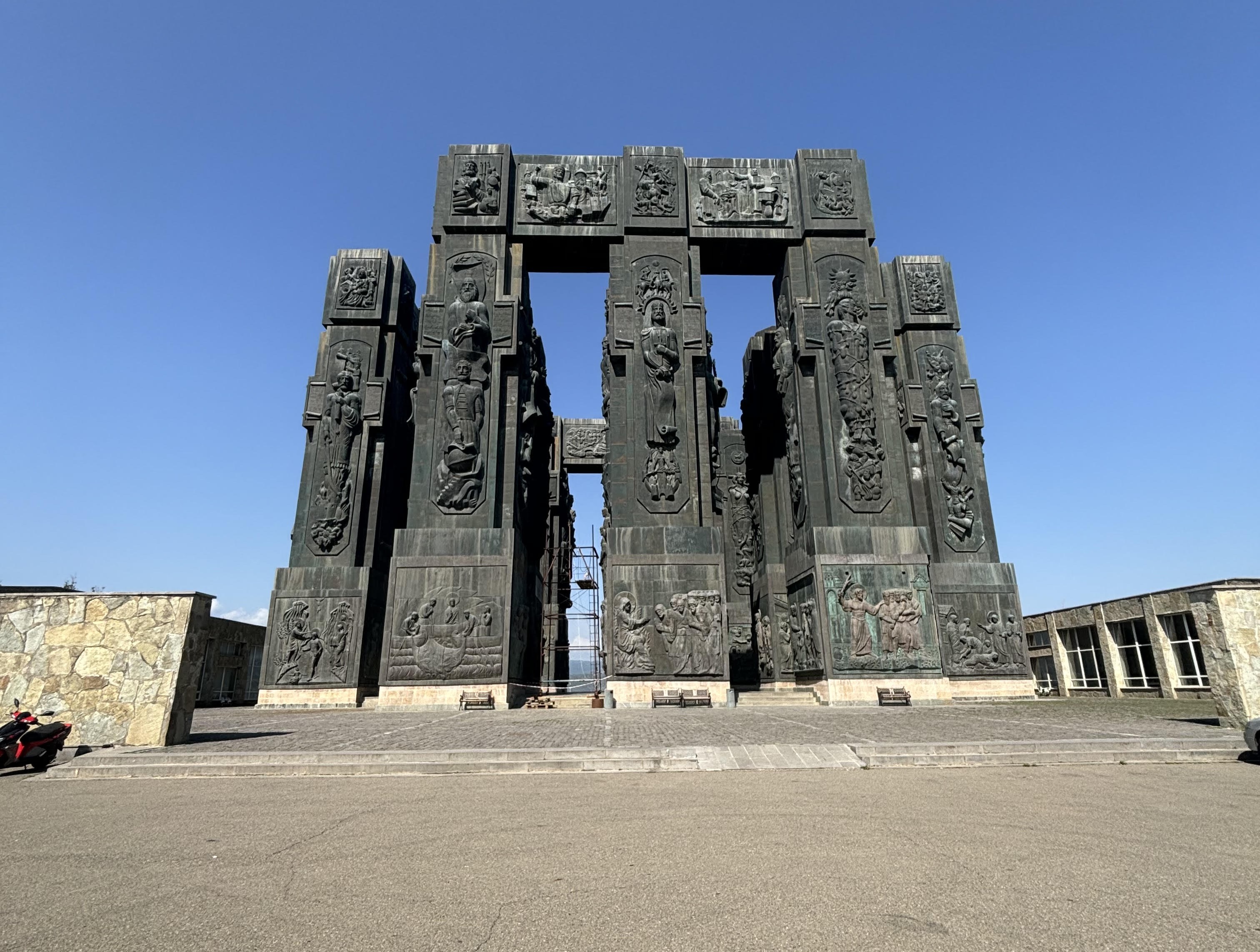 The Chronicles of Georgia was one of the first places I saw on the trip given I spent the first day sick in the hotel getting rest. It was on the outskirts of Tbilisi and the structure left a large impression. The structure consisted of sixteen pillars, each having a large depiction on each side showing an important moment of Christianity. It very quickly answered my question of what religion is most prominent in the country. As a christian myself it was very interesting to see. In front of the whole monument was also a large metal scroll on the ground with Georgian writings on it. Off to the side of the monument was a cross that stood out due to the beam moving across being curved down.